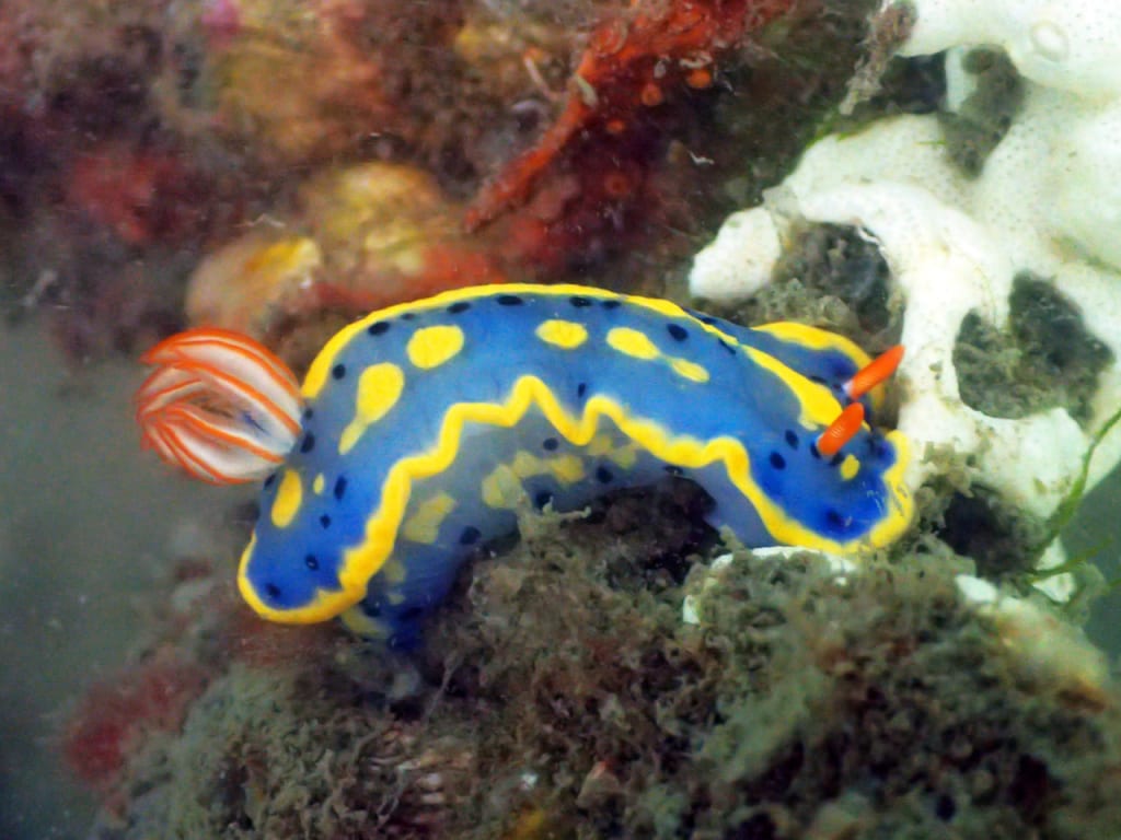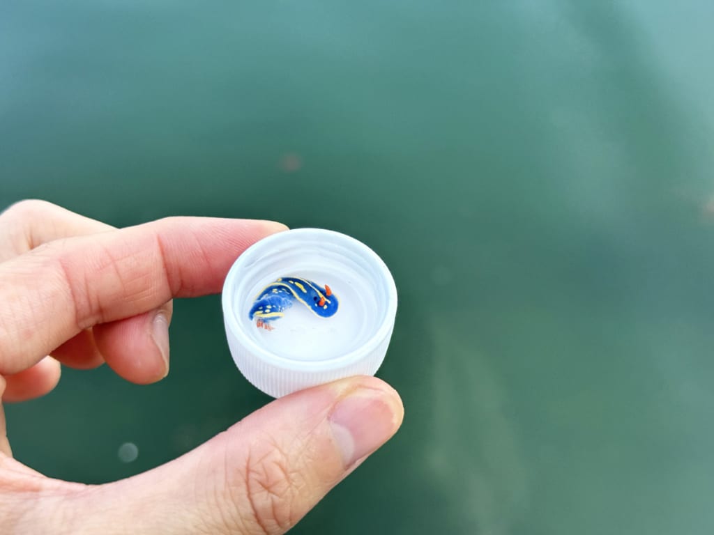 世界に6000種以上いるとも言われるウミウシの仲間。アオウミウシはあざやかな青、黄の体色、オレンジの触角とエラが特徴。本州全域の浅瀬で見られる、磯遊びの定番のウミウシです。