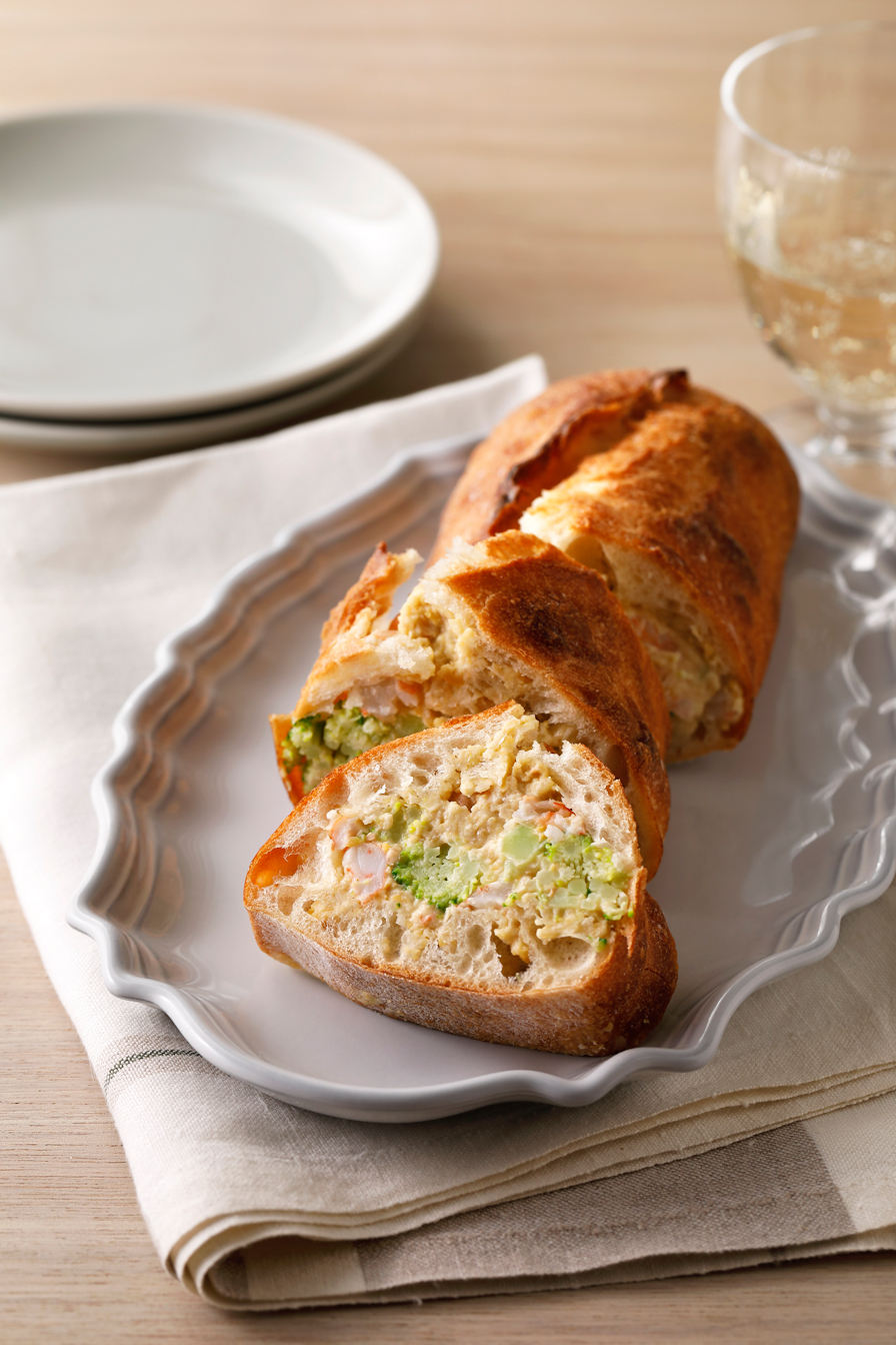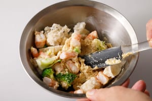 ひよこ豆と(A)を一緒にハンドブレンダーやミキサーにかけて(すり鉢で潰しても)、なめらかなペースト状にする。ボウルに移したら、(1)でくり抜いたバゲットの中身(30~40g)、エビ、ブロッコリーを加えて混ぜる。味を見て塩、こしょうで味をととのえる。