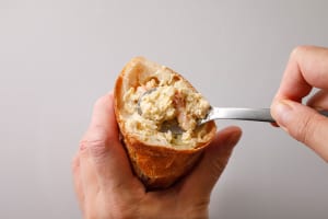 バケットは半分に切ってから、包丁やスプーンを使って中をくり抜く。くり抜いたバゲットは小さくちぎる。