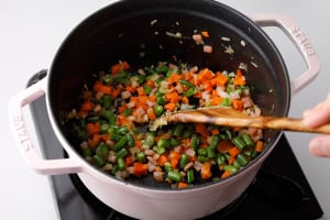 鍋にオリーブオイルを引き、にんにくとベーコンを香りが立つまで炒める。玉ねぎを加え、塩をひとつまみふり、しんなりするまで5分以上炒める。にんじん、さやいんげんを加え、火が通るまで炒める。さらに白いんげん豆、トマト缶を加え、サッと炒める。