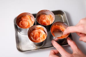 バターを塗って冷やしておいたセルクルに、サーモンを外側から中心に向かってくるっと巻いて詰めていく。