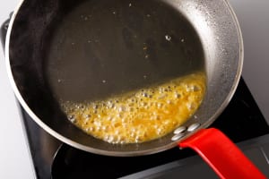 (3)を取り出し、同じフライパンにオレンジ果汁と白ワインを入れ、中火にかける。半量になるまで煮詰めたら火を止め、バターを少しずつ加えてフライパンを揺すりながら乳化させる。塩で味をととのえ、お好みでオレンジの皮を加える。