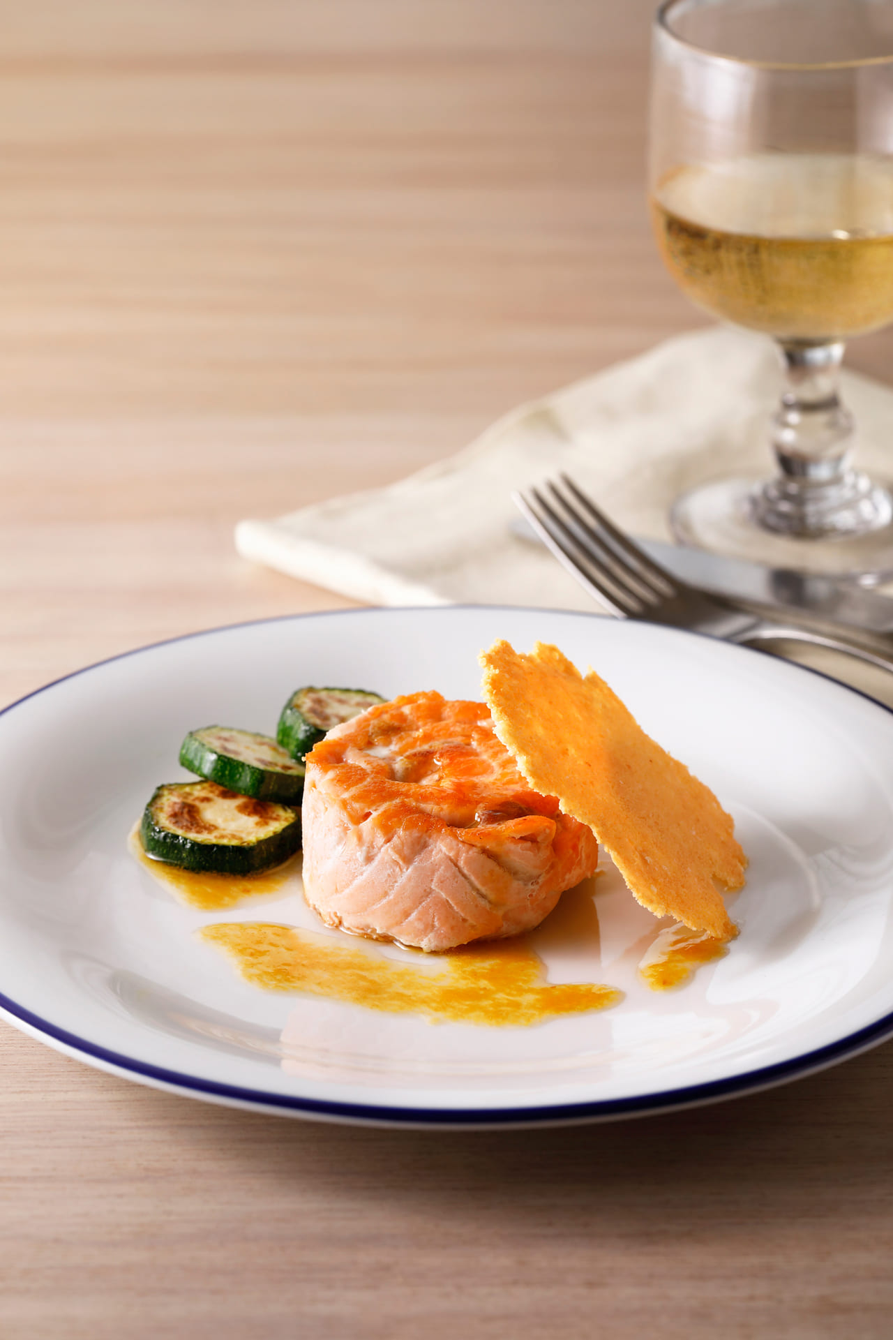 粗熱が取れたらサーモンを型から抜き、ソースをかける。パルメザンチュイル、ズッキーニのソテーを添える。