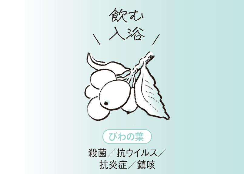 また、乾燥したびわの葉を20分ほど煎じて風呂に入れた「びわの葉風呂」は、温熱効果で湯冷めしにくくなります。
