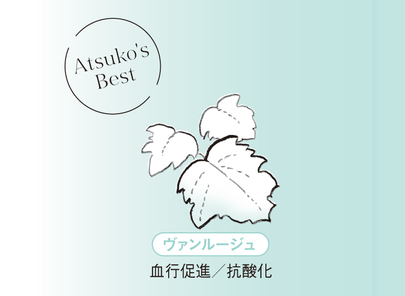 赤ブドウの葉であるヴァンルージュはポリフェノールの中でも、血行促進はもちろん、抗酸化作用があり、アンチエイジングにも効果的なレスベラトロールという成分を多く含みます。