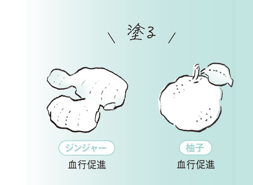 ベースオイル5㎖に、ジンジャーの精油1滴垂らす、もしくは柚子の精油を数滴垂らして冷えた部位をマッサージしましょう。