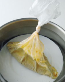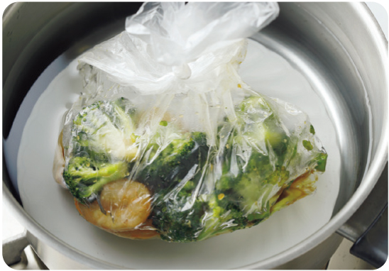 袋の中でやさしく加熱するから、魚の身が崩れたり、煮汁で色がにごる心配がありません。