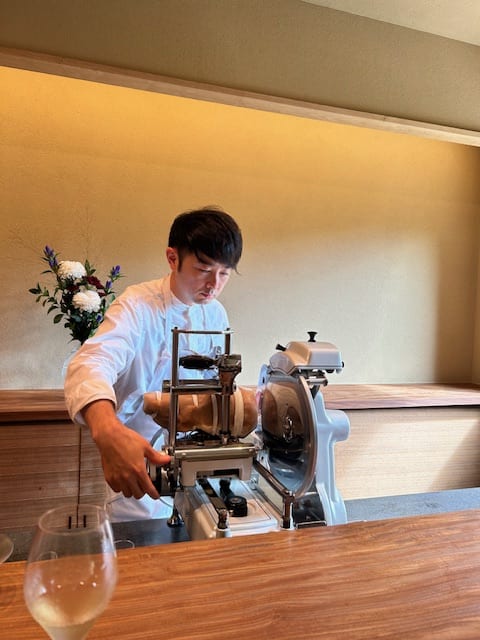 カウンター中央に鎮座する生ハムカッター界のフェラーリと呼ばれるイタリア・ベルケル社のスライサーで薄〜くスライスされた生ハムはとろけるよう。