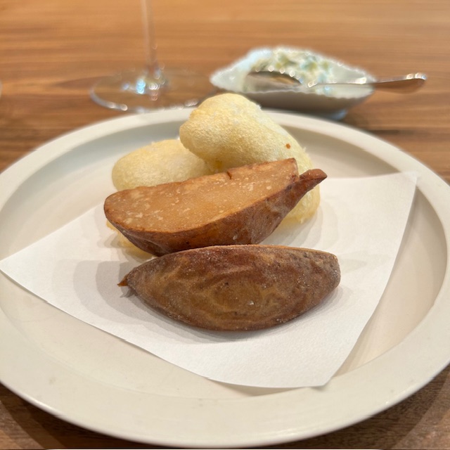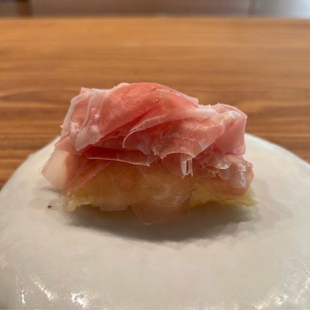 イタリア風の揚げパン、トルタフリッタに乗せて口に運べば揚げたての熱々の生地で生ハムの塩気と旨みが一層際立ち、絶妙のハーモニーを奏でる。