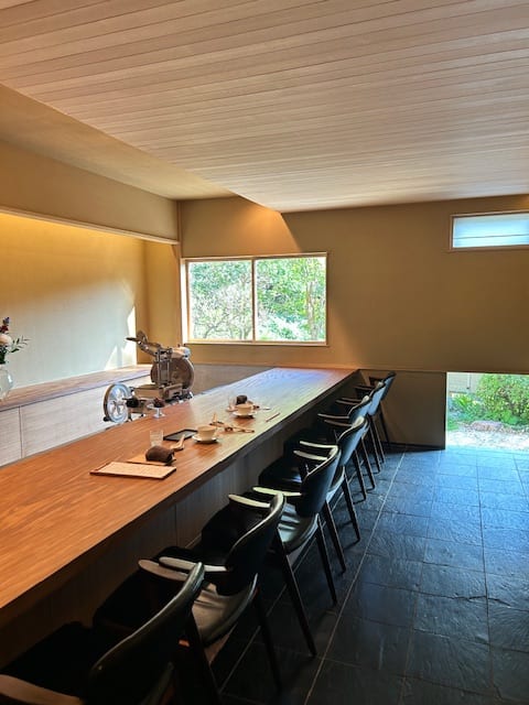 店名は青天の霹靂の「ヘキレキ」から。店内は7席のカウンターと個室がひとつ。庭の緑を眺めつつ、のんびりゆっくり至福の時間が過ごせる。