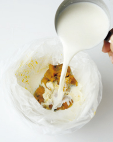 1. アイラップにかぼちゃを入れ、600Wの電子レンジで4分加熱する。熱いうちにふきんで包み、かぼちゃをつぶす。