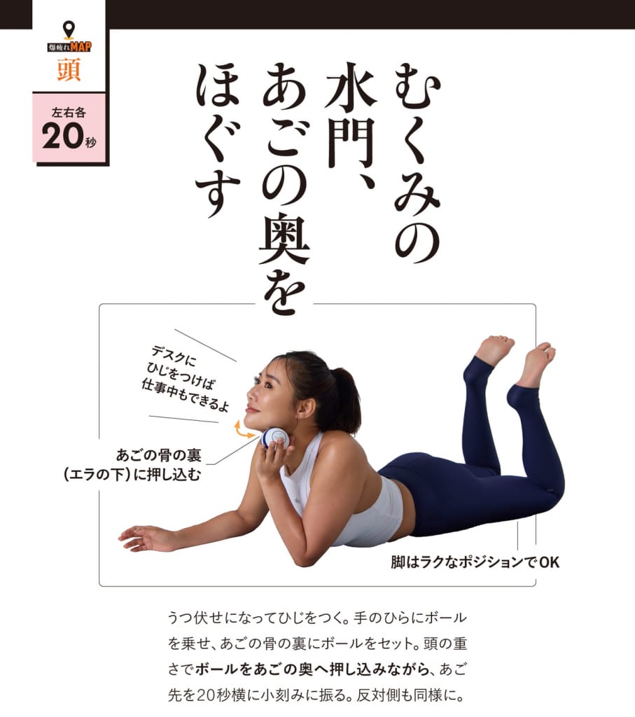 Yumico先生「皆さんは今、背もたれに背中をつけながらやっていますが、少し前かがみになってもらって、ギューっと体重を乗せていくと、より痛く感じませんか? ボールに顔を沈めながら、皮膚を揺らすように。これ、すごい痛いんですよ。でも大事な写真を撮る時だったり、今日は可愛くいたいなとか、化粧のノリが悪いなと思ったら、顎二腹筋(がくにふくきん)をほぐすと、むくみとかリンパの流れがすごく良くなるので、おすすめです。」
