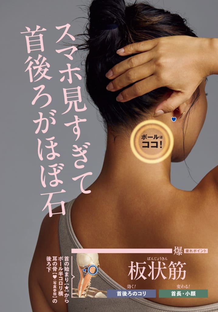 Yumico先生「偏頭痛や肩コリも、肩より首をほぐした方が楽になります。板状筋(ばんじょうきん)が固くなっているなと思ったら、後頭部と合わせてほぐすと、痛みもすぐに解消できるので、ぜひ組み合わせて参考にしてください」