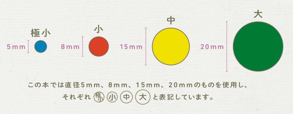 書籍の中では直径5mm、8mm、15mm、20mmの丸シールを使用し、それぞれ極小、小、中、大と表記しています。