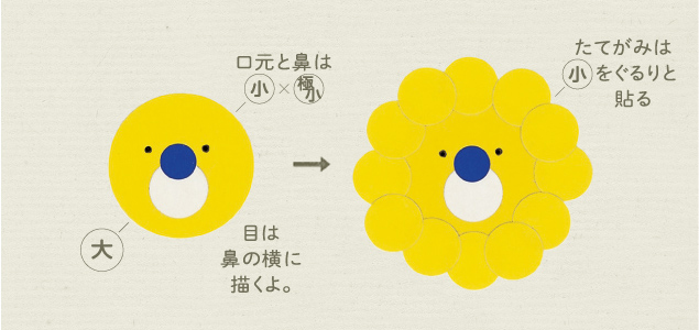 2. 小の丸シール(黄)を、顔をぐるりと囲うように貼り、たてがみを作る。