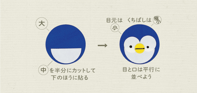 1. 大の丸シール(青)の下のほうに、半分にカットした中の丸シール(白)を貼る。