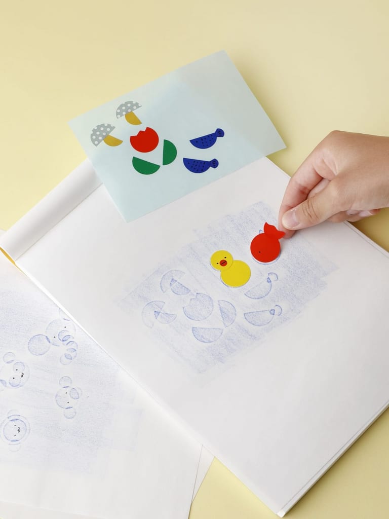 5. さらに、浮き上がった形に合わせて、(1)のシールを貼って遊ぼう。