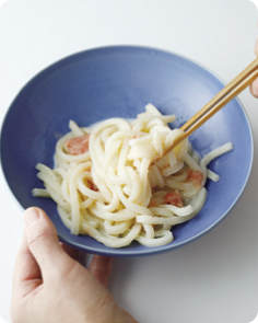 明太子はほぐしながらのせたら、うどんが温かいうちに全体をざっくりと混ぜます。