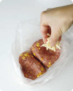 1. アイラップに合い挽き肉、コーン、(A)を入れ、よく混ぜ合わせる。