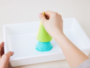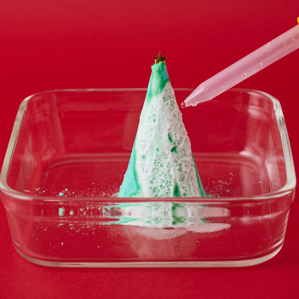 重曹を固めたツリーに酢をかけると、シュワシュワ反応して白い雪が積もった! じつはこれ、「二酸化炭素の泡」。