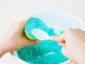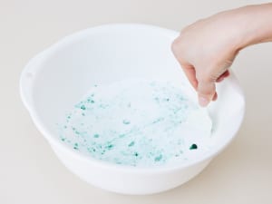 3. ボウルに重曹と緑の着色料を入れ、よく混ぜる。