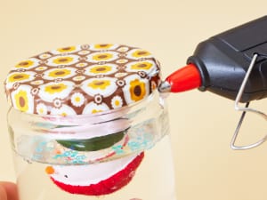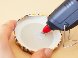 1. 瓶のふたの裏にグルーガンをつけ、好きなフィギュアを接着する。