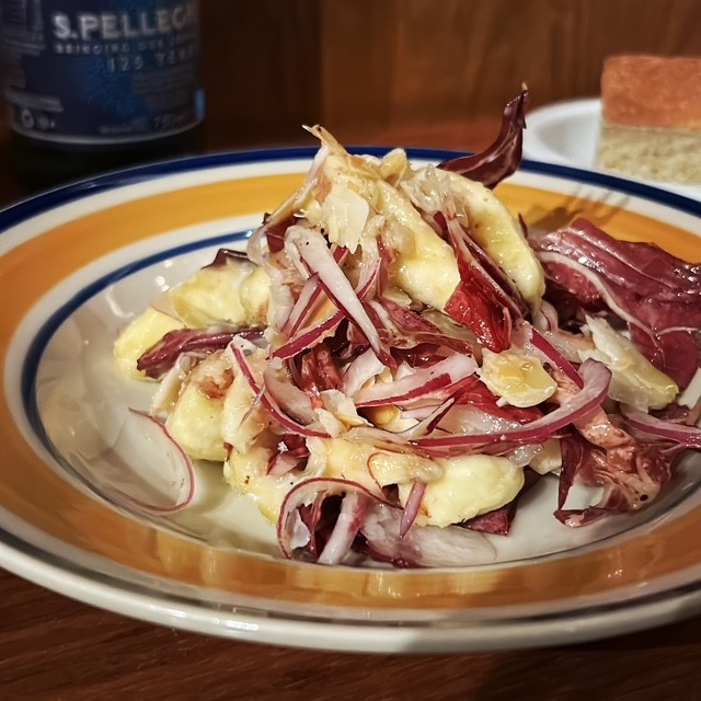 フルーツと合わせることが多いブッラータはいちごのスープ仕立てやレモンのコンフェと合わせて。マッシュルームやほろ苦さがたまらないラディッキオのサラダもワインがすすむしっかりとした味付けが小気味よい。