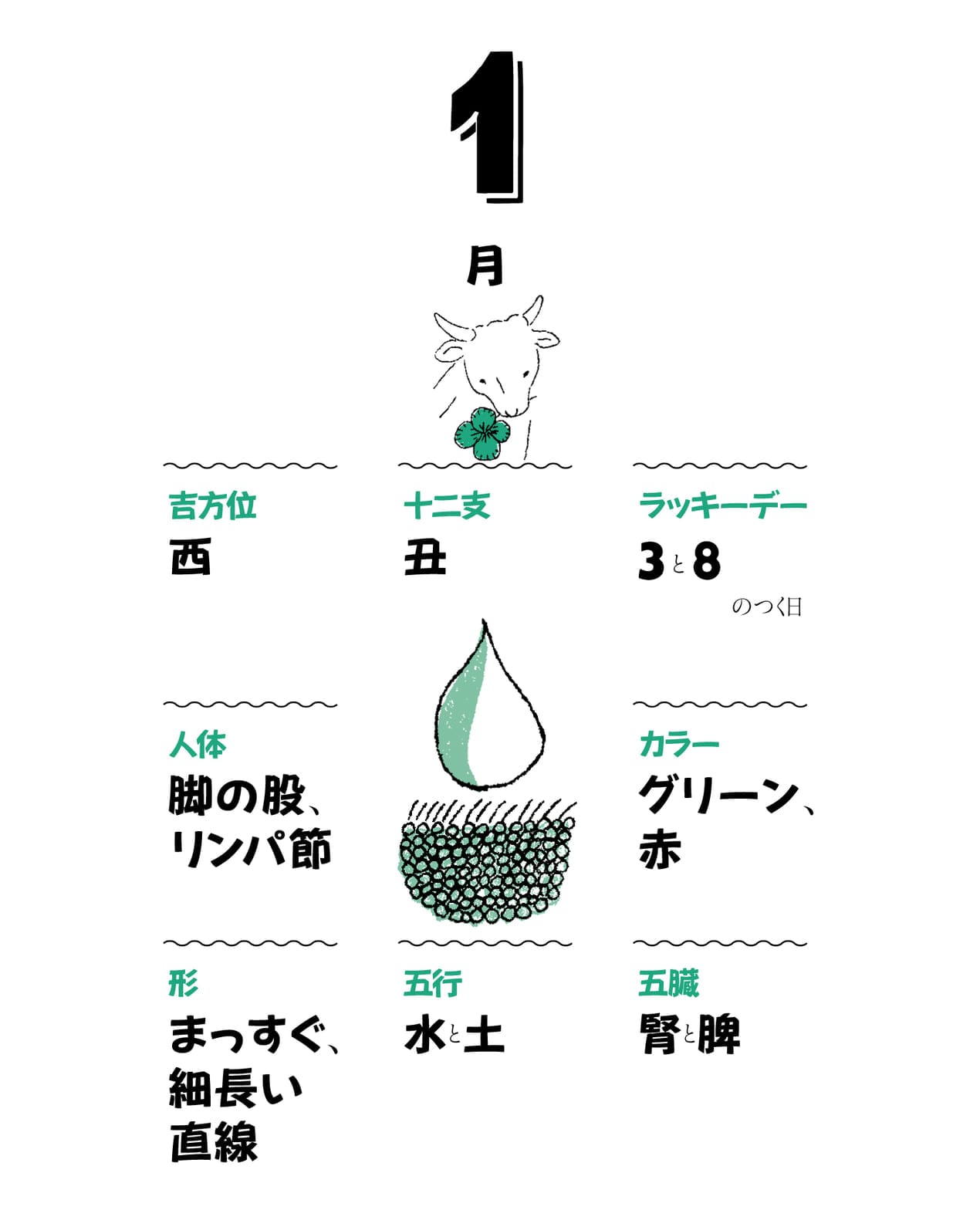 十二支の「丑」は、身体でいうと股のあたりやリンパなどを司ります。冬の土用に入り、「土」の気と寒さで凝り固まっている身体を、リンパマッサージでほぐしてあげましょう。「土」の気で凝り固まるだけでなく、これも「丑」の性質から、寒さに身体がくくりつけられているはずなので、しっかり流し、伸ばすことが、さらなる開運につながります。