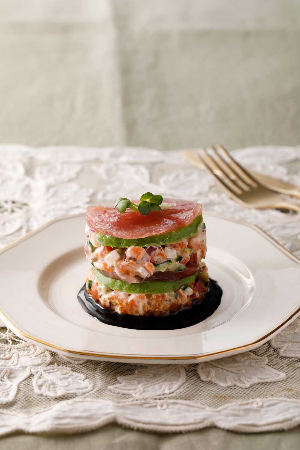 サーモンタルタルとマグロアボカドのミルフィーユ仕立て