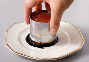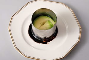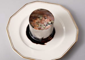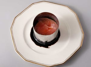 皿に(1)のソースを敷き、その上にセルクルをのせる。そこに、(2)のサーモンタルタルを平らに詰め、次にアボカド、次にマグロ、もう一度タルタル、アボカド、マグロの順に詰める。