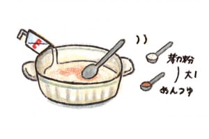 2. 耐熱皿に薄力粉とめんつゆを入れ、牛乳を少しずつ加えながらよく混ぜる。