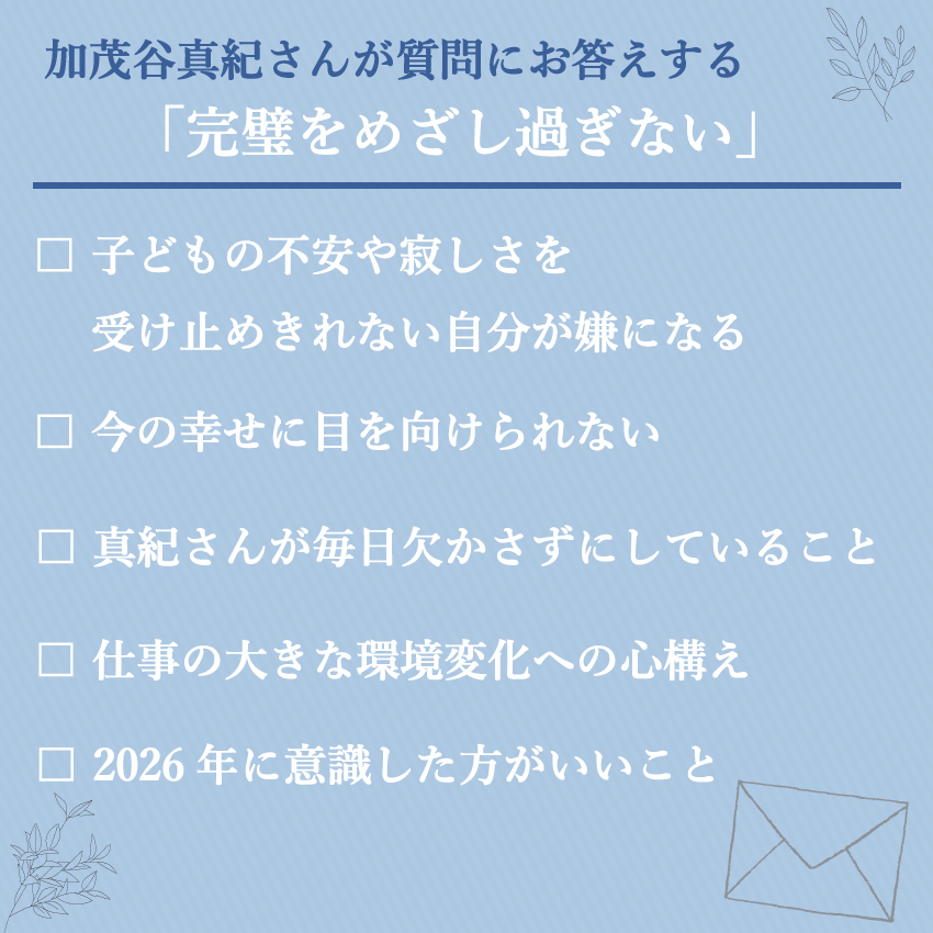 など、「完璧をめざし過ぎない」ことについて教えていただきました。