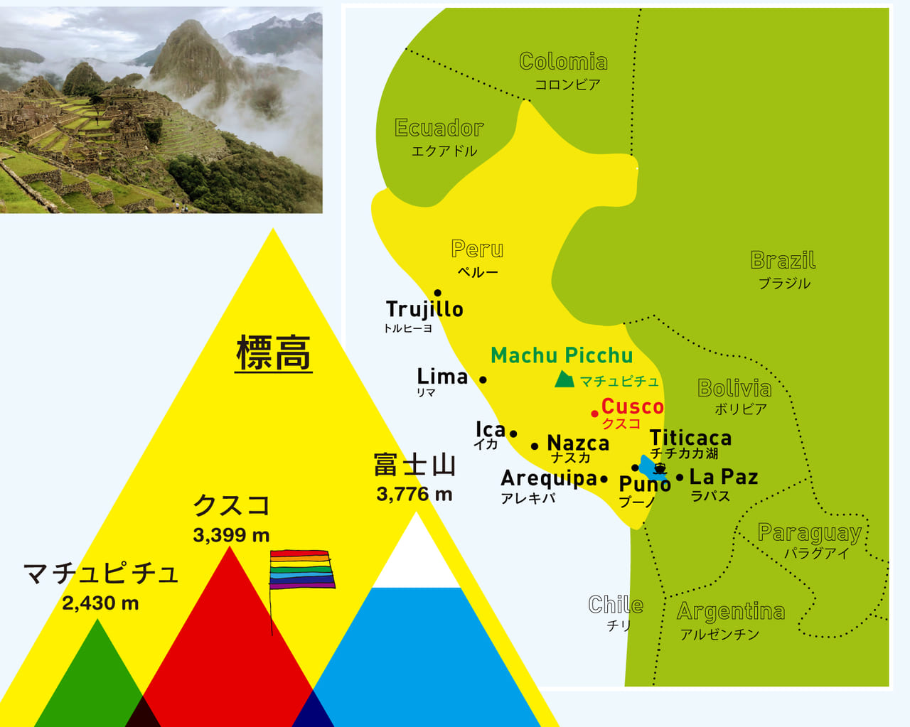 ペルーは、日本から約15,500km(地球の円周の約3分の1)離れた南米にある国で、「マチュピチュ」や「インカ帝国」、「ナスカの地上絵」が有名です。ミユキさんが「足止め」されたペルーの町・クスコは、標高3,399m、アンデス山脈の中央に位置する都市。マチュピチュ観光の玄関口ともされている町で、多くの観光客が足を運ぶ場所です。