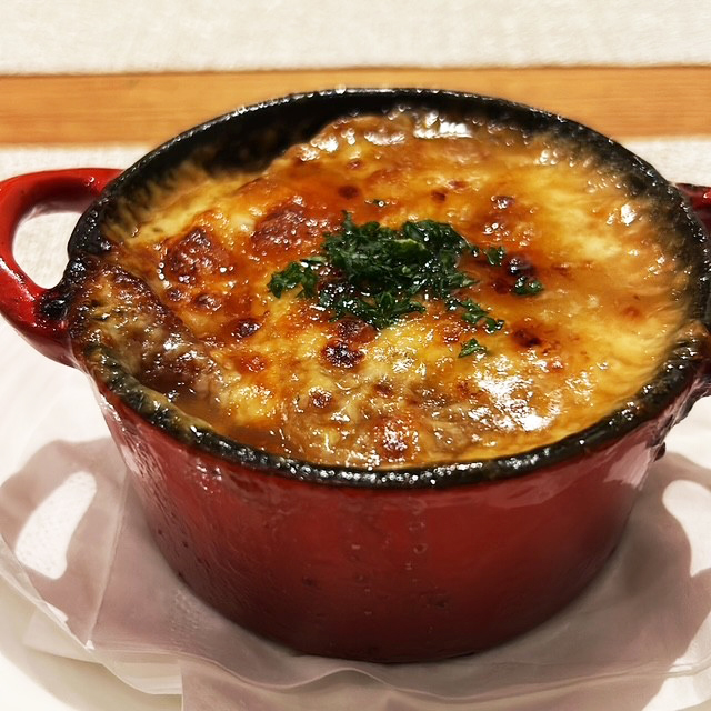 洋食の要であるドミグラスソースも味わい深いのに、食べ疲れることがない。フレンチレストランのような小粋な前菜でワインを楽しみ、舌を焼くような熱々のオニオングラタンにホッと癒される。