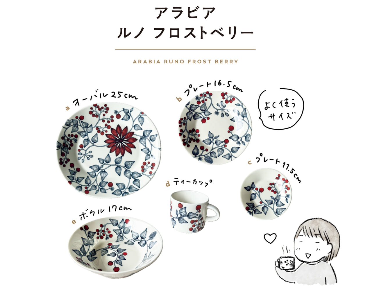アラビアのRunoシリーズのフロストベリーは、デザイナーのヘイニ・リータフフタ氏がデザインしたブルーを帯びた線と赤いベリーの可愛らしい柄が特徴的なシリーズ。シチューやスープ、グラタンなど冬に食べたくなる料理にぴったりなうつわは、scopeさんのWEBサイトにて冬季限定で販売されています。