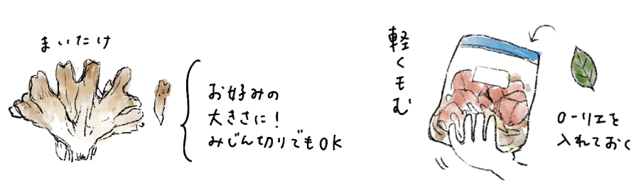 1. 小分けにした舞茸と、フォークで穴を開けた牛肉とローリエを保存袋に入れ、軽くもんでから一晩冷蔵庫で寝かせる。