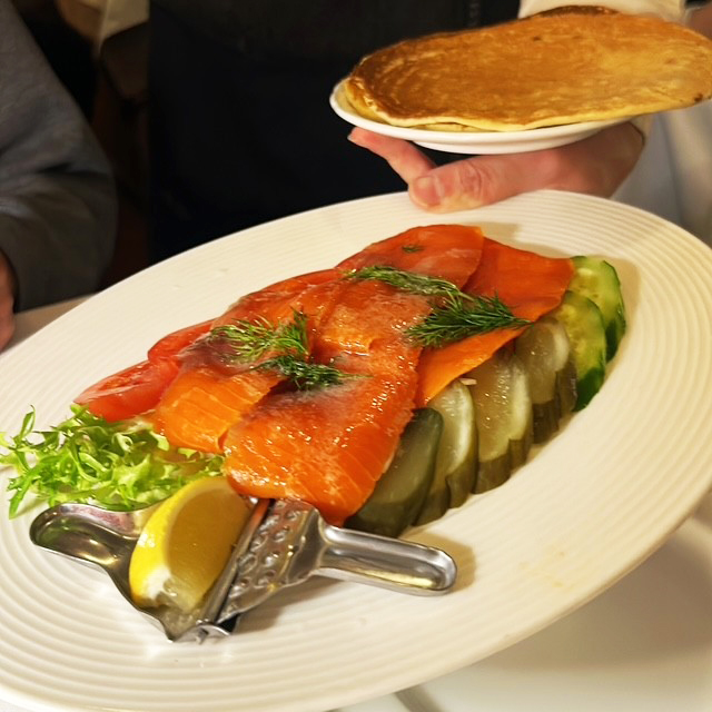 大皿に美しく盛り付けられたサーモンマリネをふんわり柔らかな薄焼きのパンケーキにサワークリームと一緒に巻いていただく一品が食前酒によく合う。