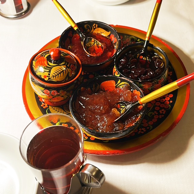 バニラの香りのいちごジャムに、グリオットチェリー、珍しいブルガリアのローズジャムを口に含ませ、紅茶をいただく。ロシア特産のカラフルなホフロマ塗りの木製のスプーンが可愛らしい。