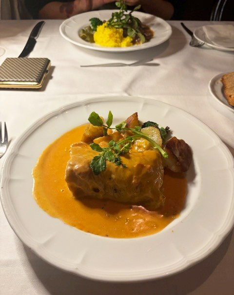 続いて、ビーツ入りのボルシチとピロシキ(焼きと揚げから選べる)にメインはヒレ肉を使ったビーフストロガノフかウクライナ風のロールキャベツ、ロシア風の仔牛のローストから。