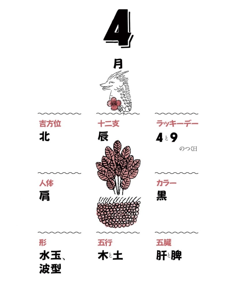 十二支は、それぞれ人体にも当てはめることができます。4月の辰は、肩。新生活で肩に力が入っている人は、なるべく意識して脱力するようにしてみてください。