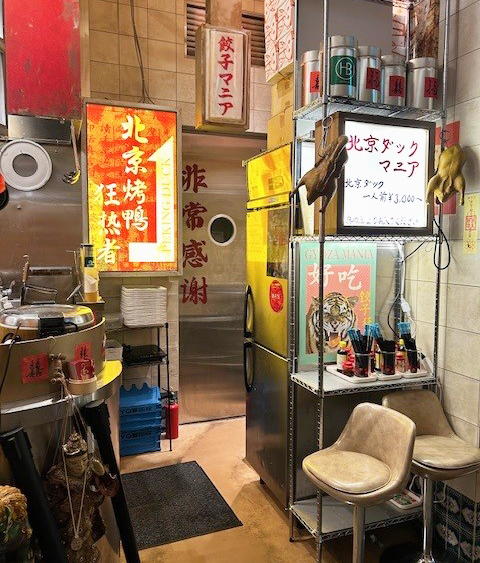 ところは虎ノ門ヒルズ、人気の飲食店が並ぶフロアの中でも明るいネオン輝くチャイニーズポップなインテリアが目を惹く餃子マニアの店の横に怪しげな扉があるのをご存知だろうか。この扉の先に広がる秘密クラブのような空間、そこが今回ご紹介する「北京ダックマニア」だ。