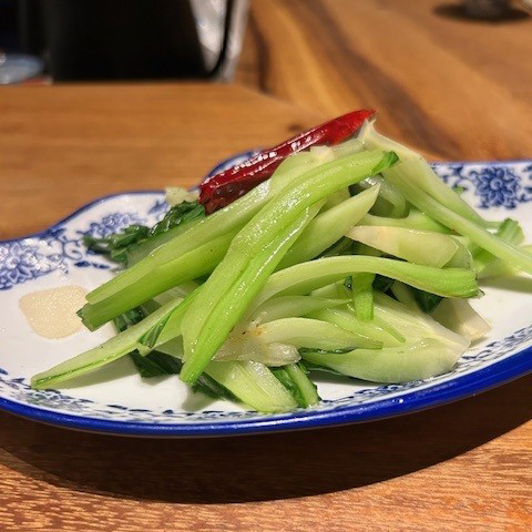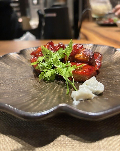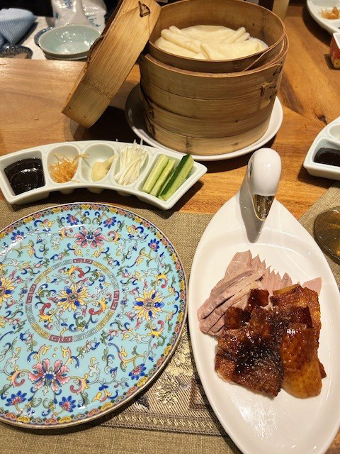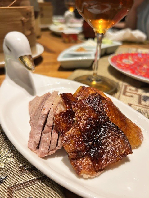 食前にいただく滋味あふれるスープも嬉しい。クラゲやパクチーサラダ、トマトの杏露酒に漬け込んだ甘酸っぱいマリネ、ブルーチーズを合わせた(個人的に大ヒット)焼豚、青菜炒めなどを楽しんでいるうちにいよいよ登場するのが本日の主役である北京ダック。
