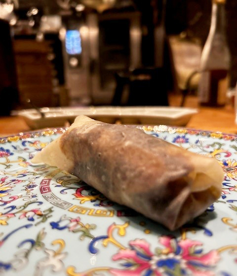 厨房では先ほどから目の前で料理人がダックに熱い油を何度もかけてツヤツヤの飴色に仕上げているので期待は高まるばかり。肉付きの状態でカットされたダックは見るからに香ばしく皮はパリパリ、そこに白髪ネギやきゅうり、自家製の甜麺醤、にんにくのマッシュなどの薬味と蒸したてのクレープ状のカオヤーピンを伴って登場する。