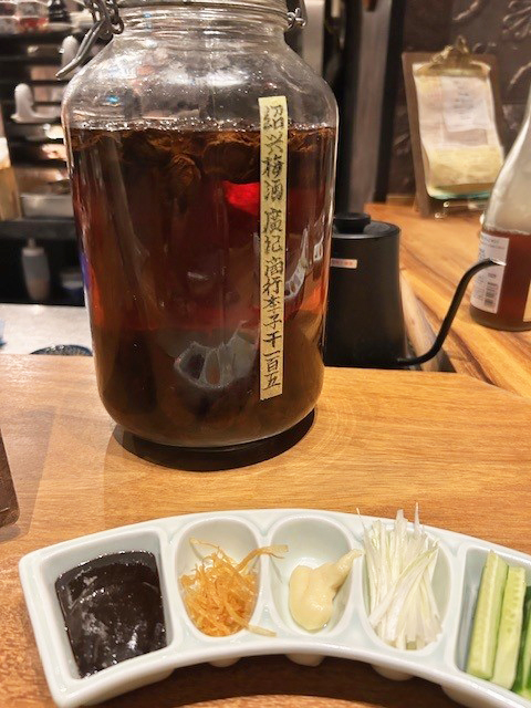 コースはまず、鴨ジャーキーとガラスのポットで供される鴨の薬膳スープからスタート。ほどよい噛み心地でしっとりの鴨ジャーキーは旨味たっぷりで後を引く。ビールのアテにもぴったりだ。